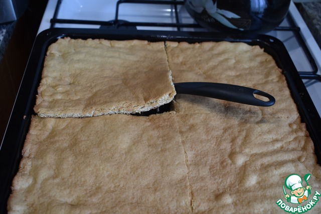 Готовый корж прикрыть полотенцем на 5-7 минут. Разрезать на 4 ровных части и отправить остужаться.