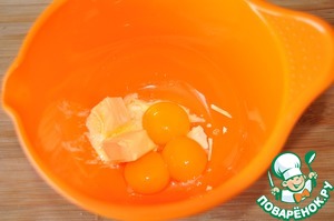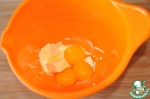 • В третью миску кладём желтки и подтаявшее сливочное масло.