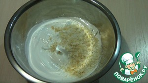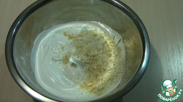 Добавить во взбитые белки измельчённый миндаль и кокосовую стружку. Перемешать и крем готов.