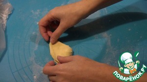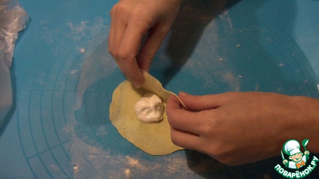 От готового теста отщипываем кусочки (по грамм 20), и тонко раскатываем в прямоугольный пласт. Зрительно делим пласт на 4 части, и в одну из частей (ближе к середине) укладываем начинку. Начинки примерно 0,5-1 ч. л. Много начинки не кладите, иначе она разорвёт тесто при выпекании.