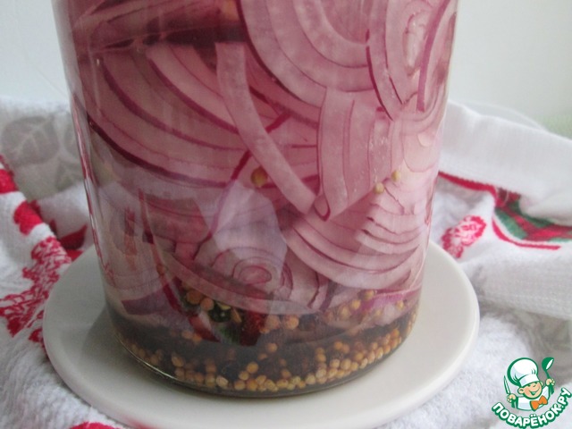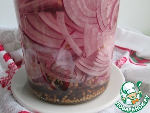 В чистую сухую банку слоями выкладывать полукольца красного лука, пересыпая каждый слой смесью специй. Заполнить банку полностью.