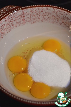 Нам нужно 4 яйца. 2 из них поделить на желтки и белки. В посуду к желткам добавить оставшиеся 2 яйца и сахар и начать взбивать миксером до пышной белой пены. -