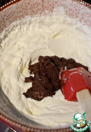 В отдельной посуде взбить оставшиеся 150 мл холодных сливок до крепкой пены. Влить остывший белый шоколад. Аккуратно перемешать лопаткой до однородности.