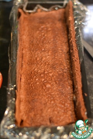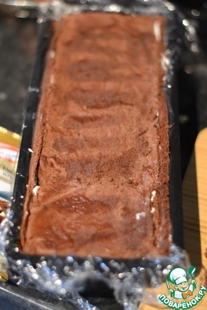 Нам нужна продолговатая форма типа кексовой. Накрыть ее пленкой. Вырезать кусок бисквита так, чтобы его можно было положить в форму и он покрывал всю форму. -
