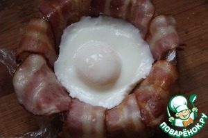 Уложить по яйцу в подготовленные чашки с ветчиной или беконом.
