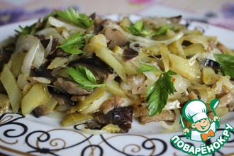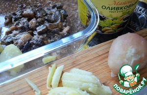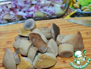 - Грибы (200 г жареные, 150 г маринованные белые или другие лесные) — 350 г