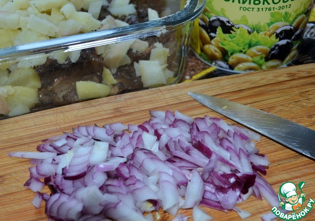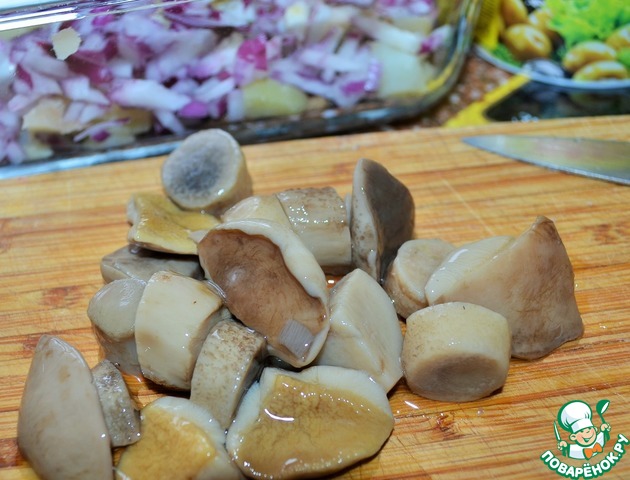 Маринованные грибы нарезать и добавить в салатник.