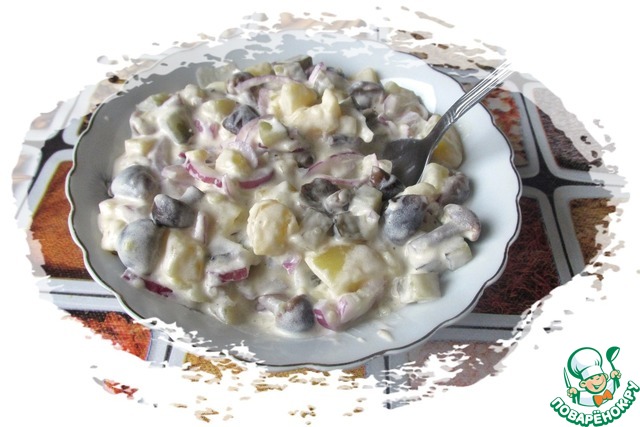Грибные салаты многими любимы. А как вам салат с жареными и маринованными лесными грибами, заправленный майонезом "Оливковый" и зернистой горчицей?! А имея постный майонез, вы смело можете подать салат и на постный стол. Угощайтесь.