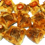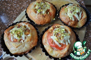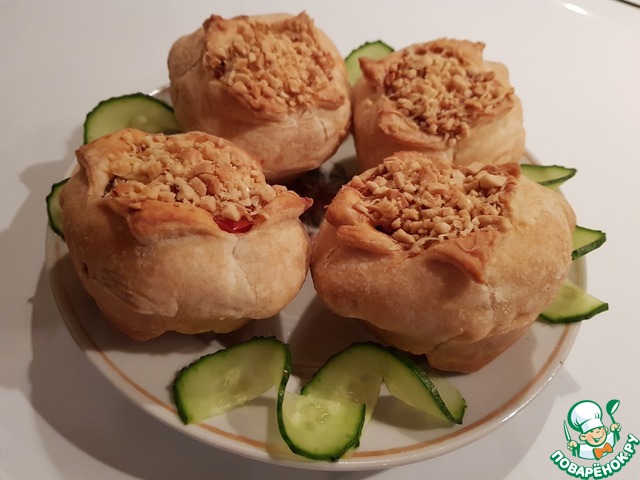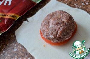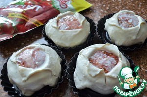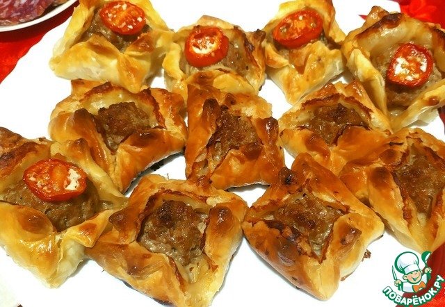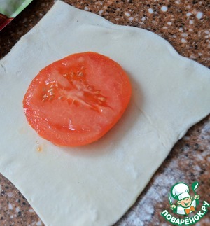 Слоёное тесто раскатать, нарезать на квадраты, 12-15 см..