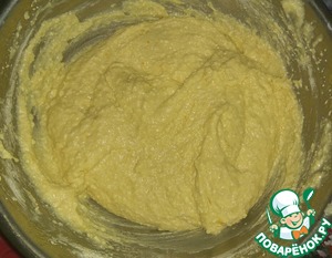Добавить муку, соль и разрыхлитель, взбить. Тесто получается густое.