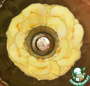 Форму смазать маслом. Ложкой, смоченной в воде выложить немного теста на дно формы. Разровнять. Можно помогать себе руками разравнивать тесто. На тесто выложить половину очищенных и нарезанных ломтиками яблок. -