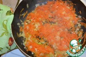 Морковь натереть на крупной терке. Лук нарезать кубиками. Обжарить овощи на растительном масле до румяности.