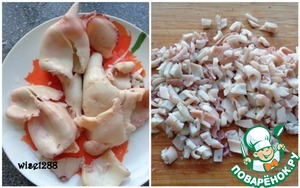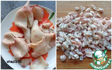 Перед тепловой обработкой нужно снять прозрачную кожицу с кальмара, для этого достаточно обдать его кипятком и удалить свернувшуюся пленку, затем вынуть хитиновую пластинку. Отварить две минуты, обдать холодной водой. Порезать не крупно.
