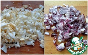 Яйца отварить до готовности. Порезать. Лук красный порезать мелко.