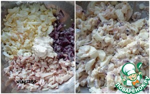Соединить кальмар, яйца, красный лук. Добавить майонез, соль. Перемешать.