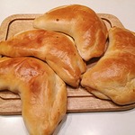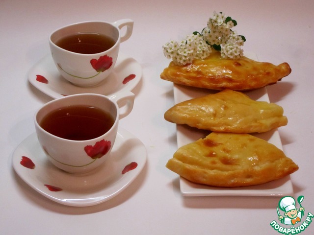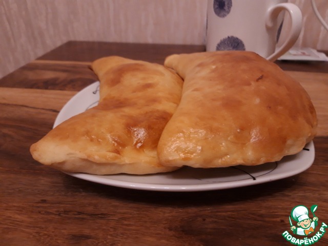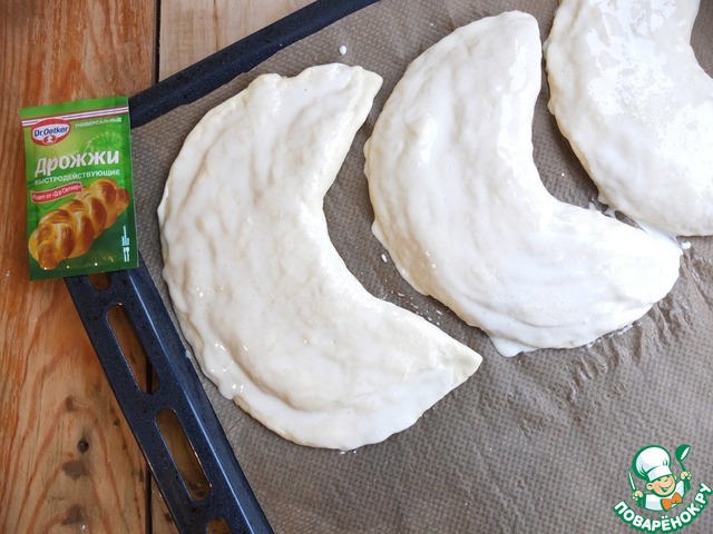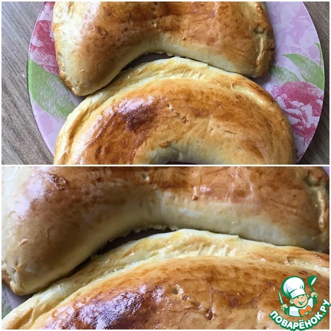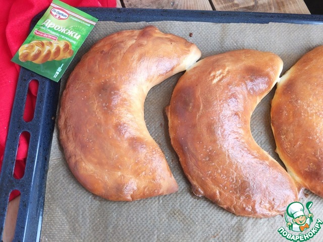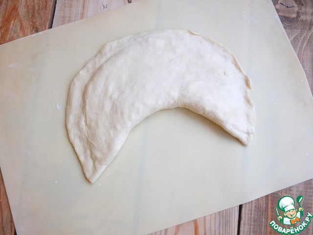 Накрываем второй половиной, тщательно защипываем края, распределяем внутри начинку и формируем полумесяц.
