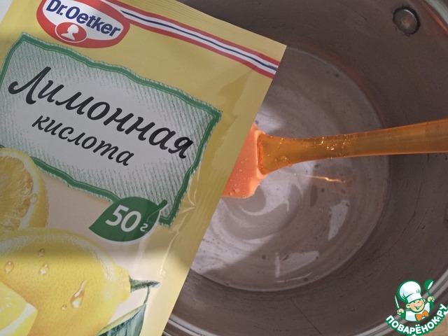 • Как только растворится сахар, добавить лимонную кислоту и перемешать. Варить сироп до температуры в 107-108 градусов (измерить можно кулинарным термометром). Если измерить температуру нечем, то можно ориентироваться на цвет. Сироп должен быть светлым чуть карамельного оттенка. Проверить сироп на готовность можно капнув на блюдце каплю сиропа, быстро остудить и захватить каплю между 2 пальцев, при их разъединении должна тянуться "толстая нить". Это говорит о готовности сиропа.