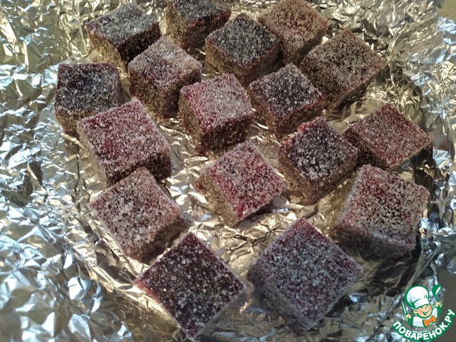 • Застывший пласт, аккуратно освободить от формы и нарезать на кусочки. Если вы используете мини-формочки, то резать ничего не нужно.