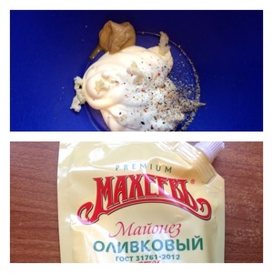 В посуду для маринования выложить майонез, горчицу, соль, смесь молотых перцев. Чеснок пропустить через пресс.