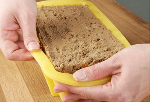 6. Выкладываем готовый паштете в силиконовую форму. Можно проложить слои масла и протертой вареной моркови, будет выглядеть особенно нарядно!