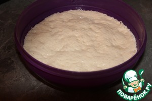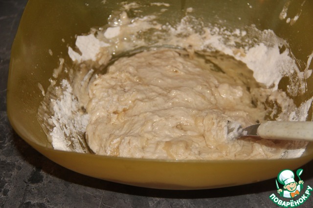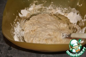 Это тесто после подъема. На стол насыпать 4 ст ложки муки, руки тоже окунуть в муку. Выложить на муку тесто и обмять. Вначале оно опять будет липнуть. Но потом "съест" муку и липнуть перестанет.