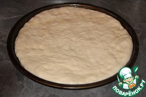 Форму для пиццы смазать оливковым или любым другим растительным маслом. Выложить тесто и руками распределить по форме. Если специальной формы нет, то просто раскатать тесто или растянуть руками (лучше растягивать) и выложить на противень.