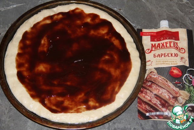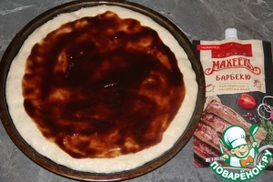 Тесто смазать соусом барбекю от Махеев. Пицца с этим соусом получилась обалденно вкусная!!! Края не смазывать.