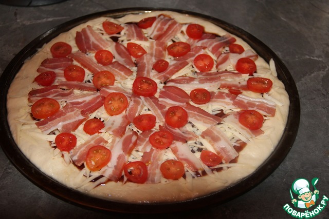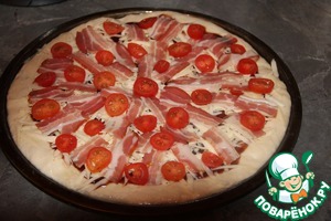 Бекон можно выложить на соус полосками, можно нарезать, как это сделала я. Помидоры нарезать кружками, выложить на сыр бекон и помидоры. -