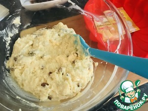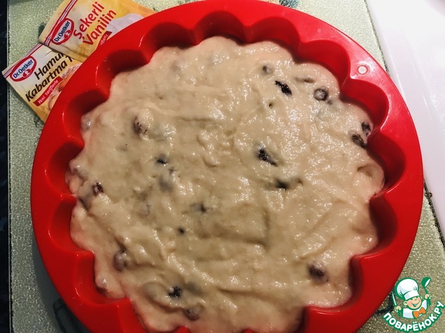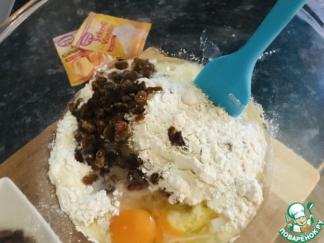 В чаше смешать - растительное масло, яйцо, молоко, сахар, мука, ванильный сахар и разрыхлитель от Dr.Oetker, добавить промытый изюм.