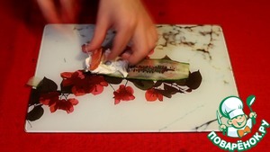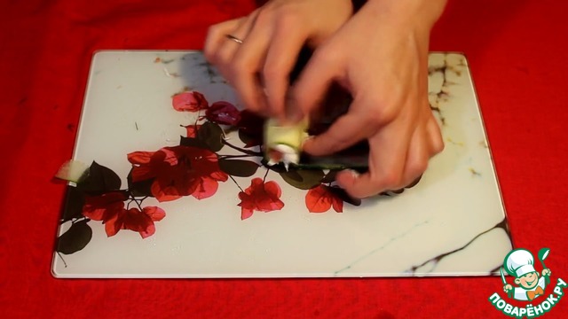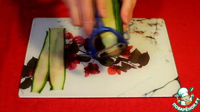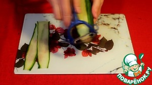• Огурец нарезаем с помощью овощечистки на тонкие полоски