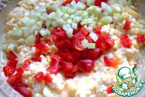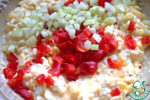 Перемешать и всыпать кукурузу консервированную.