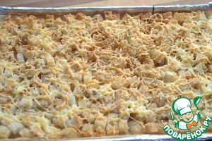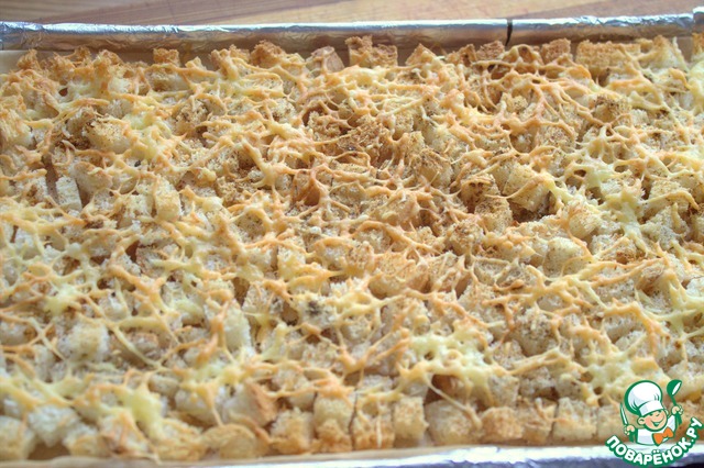 Посыпать сыром сухарики.