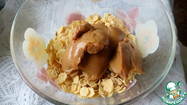 Добавить кукурузные хлопья и вареное сгущенное молоко. Перемешать.