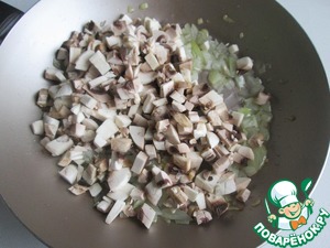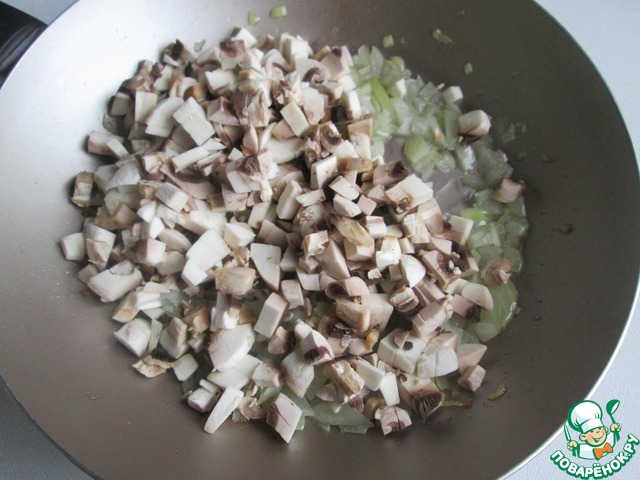 Шампиньоны мелко нарезать и добавить к луку. Обжаривать вместе 8-9 минут.