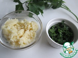 Подготовить 3 ст. л. готовой отваренной пшённой каши и мелконарезанную зелень. Я взяла петрушку.