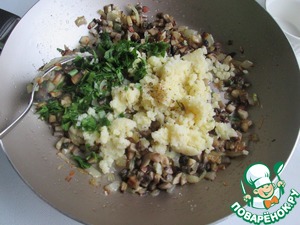 На сковороду добавить пшено и зелень. Снять с огня. Посолить, поперчить (для детей можно перец не добавлять) и перемешать.