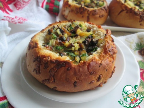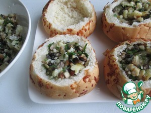 У булочек срезать верхушку, из середины удалить мякоть и выложить начинку. У меня булочки были не с кунжутом, а с сыром, это видно по оставшимся "следам"!