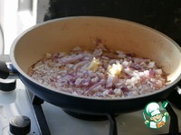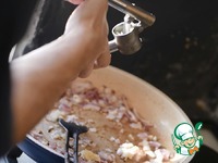 Затем пока лук разогревается, решаем, что делать с чесноком. Я его давлю и кидаю к луку - пусть немного попассеруется. Вы можете поступить так же, а можете покидать дольки чеснока целиком - тогда их надо в полтора раза больше. Можете так же не жарить чеснок, а положить раздавленный чеснок из чеснокодавки уже в остывающую заправку. Тогда его надо вдвое меньше.