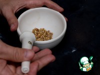 Пока лук с чесноком подрумяниваются, растолчём наш кориандр в ступке.