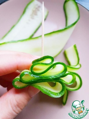Сложить ленту огурца "змейкой", посередине проткнуть зубочисткой. Расправить "ёлочку", растянув огурец ровно вдоль зубочистки.