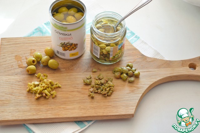Оливки и каперсы мелко нарубите