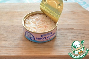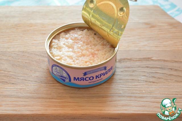 Откройте банку мяса криля и откиньте на сито, чтобы стекла лишняя жидкость