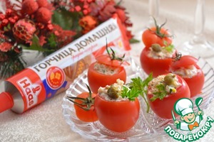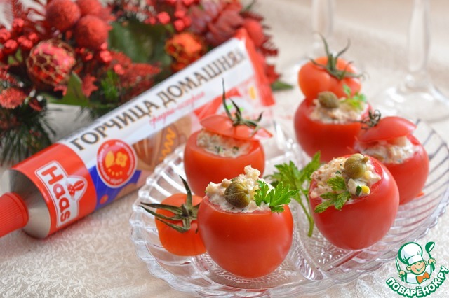 У маленьких помидоров срежьте верхушку и аккуратно кофейной ложкой выньте мякоть. Переверните помидоры на 5 минут срезом вниз на бумажную салфетку, чтобы убрать остатки влаги. Наполните помидоры начинкой и украсьте на свой вкус (каперсами или зеленью)