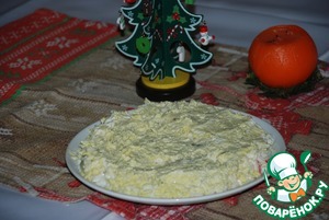 Первый слой - натертые яичные белки. Слегка промазываем майонезом ТМ "Махеев"