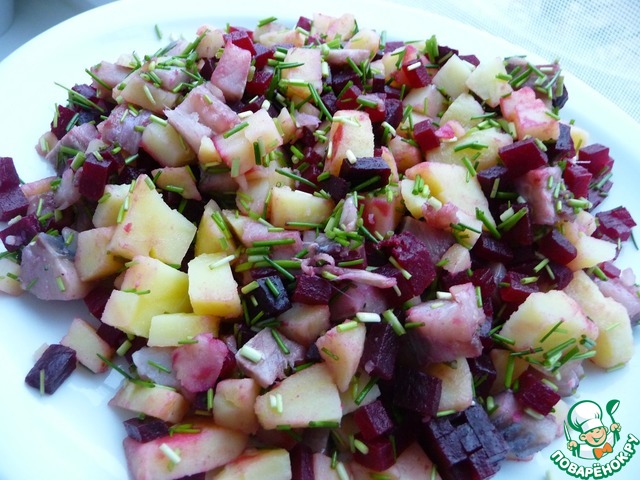 Картофель, свеклу нарезать небольшими кубиками. Измельчить шнитт-лук. Сельдь нарезать небольшими кубиками. |