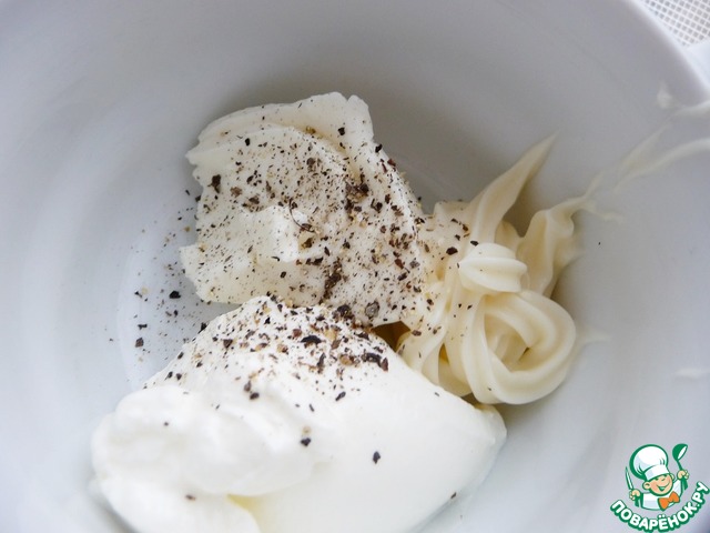 Для соуса смешать сливочный сыр, сметану, майонез. Добавить свежемолотый черный перец. Я не солила. |