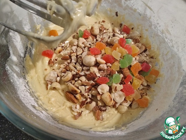 Половину муки добавить к яично-сливочной массе и тщательно перемешать. Добавить орехи и цукаты. Перемешать, чтобы они равномерно распределились.
