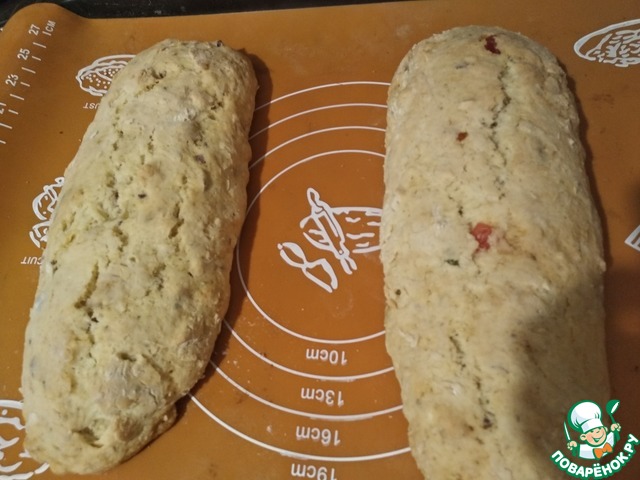 Всыпать оставшуюся муку и перемешать. Тесто получится густым, но будет липнуть к рукам. Больше муку добавлять не нужно. Выложить тесто на подпыленный мукой силиконовый коврик и сформировать колбаску. Разделить ее на 2 равные части и еще раз сформировать брусочки. В процессе приготовления они увеличатся в размере.
