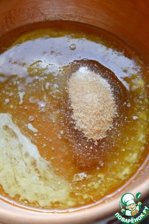 Растопить масло и всыпать белый и коричневый сахар. Взбить миксером до пышной белой массы. -