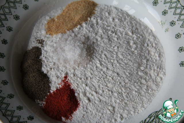 Приготовить смесь для обваливания крылышек, смешав муку со специями и солью